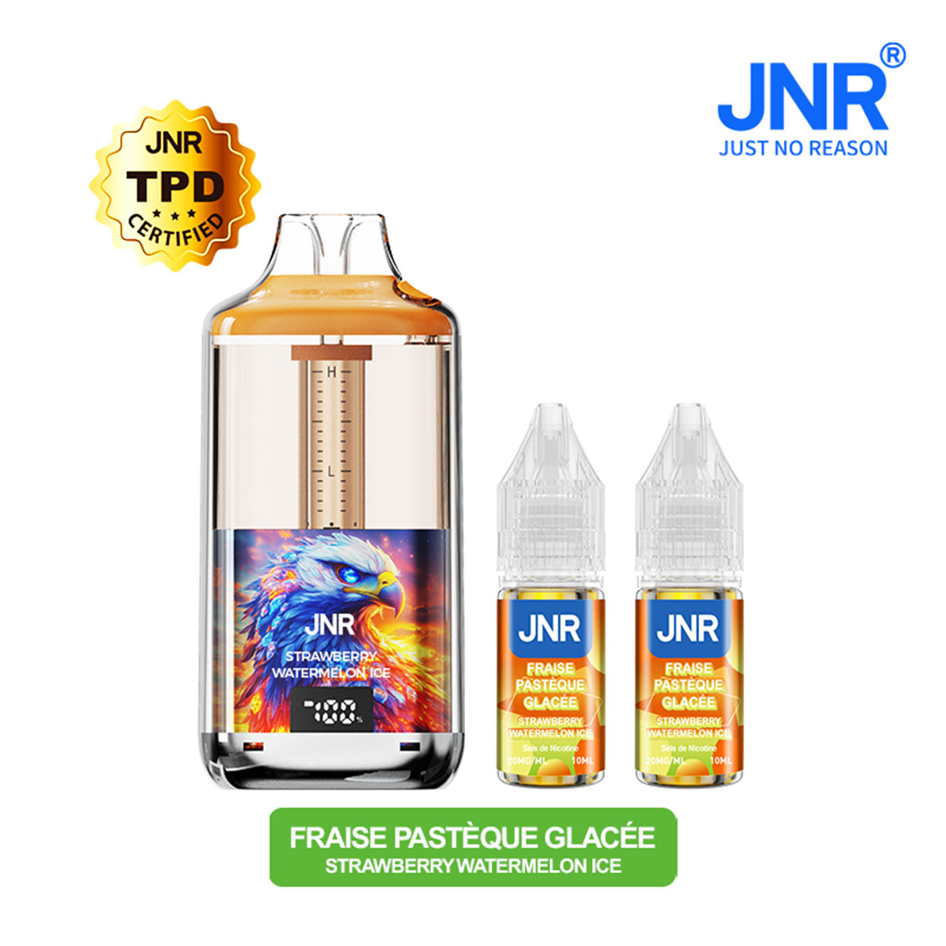La JNR 30K Falcon Gem+ Strawberry Watermelon Ice associe la fraise, douce et sucrée, à la pastèque, légère et juteuse. Une touche glaciale vient sublimer l’ensemble pour offrir