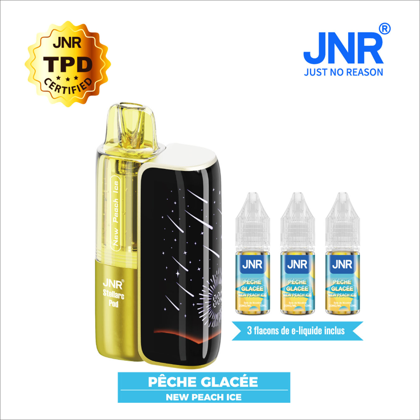 Découvrez la JNR Stellarc 50K Peach Ice, une puff rechargeable nouvelle génération conçue pour offrir une expérience de vape douce, fruitée et rafraîchissante. Ce modèle est livré avec 3 flacons d’e-liquide premium de 10 ml en sels de nicotine, pour profiter pleinement d’une pêche juteuse associée à une touche glaciale,